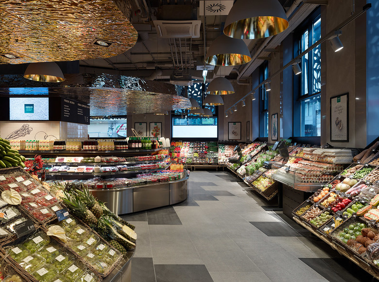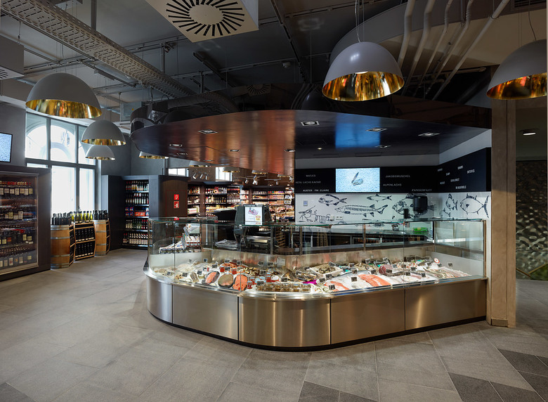 In contrast to conventional Merkur supermarkets, the subsidiary at Hoher Markt offers only food assortment, partly exclusive products. The whole salesroom is divided into three levels. The idea behind the zoning is that attractive products should encourage the customer to visit the other zones. The first floor provides a Dallmayr Cafe with special tea and coffee sorts, while the second floor houses the restaurant “Kim kocht” and a broad wine section. The levels can be accessed via staircase and three panoramic elevators which make space and goods vertically experienceable.