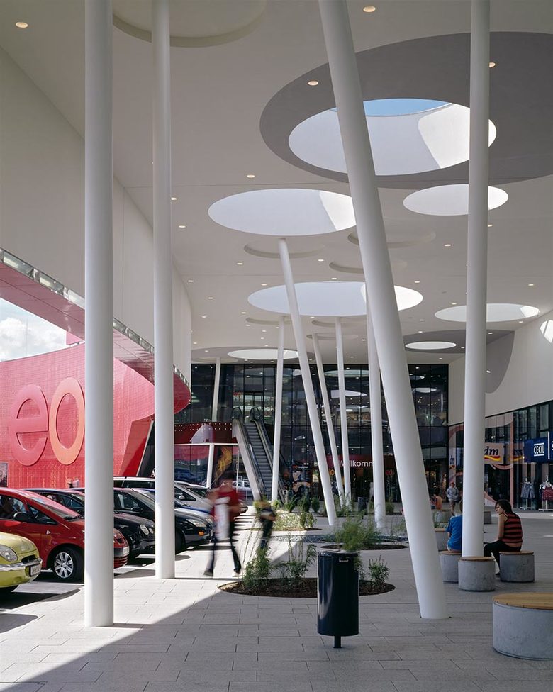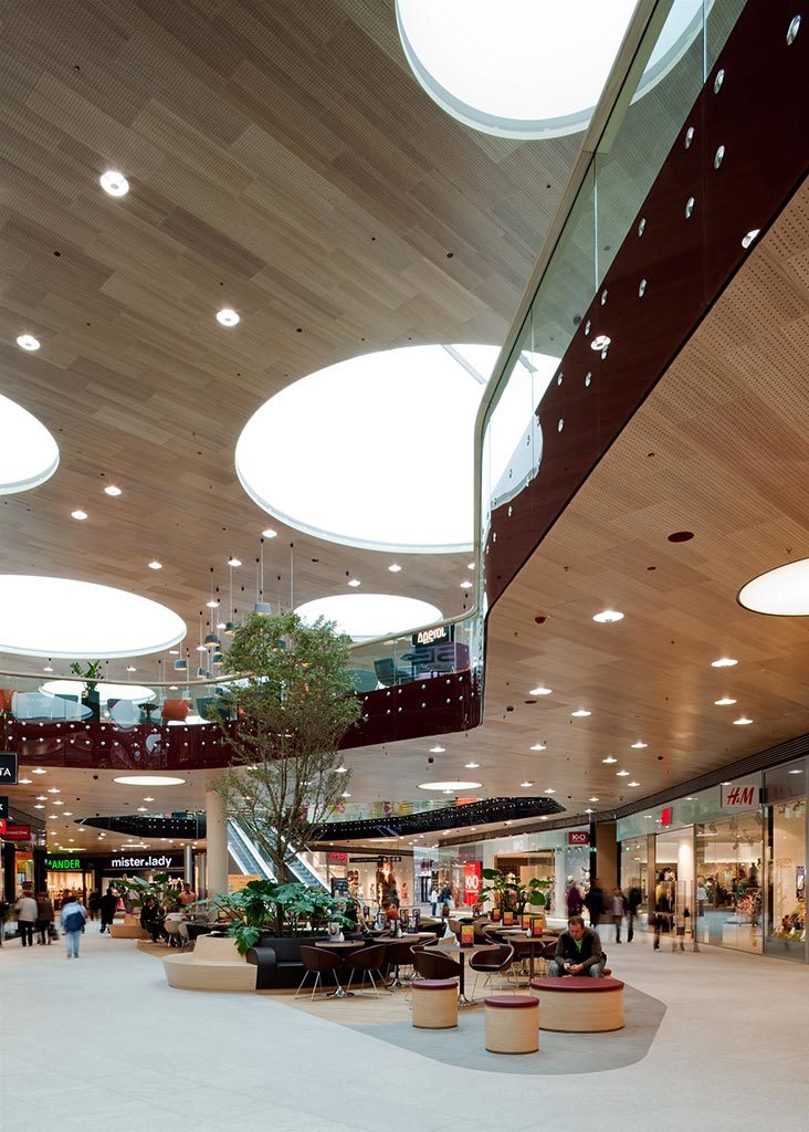 The shape of the EO is essentially determined by a LOOP - the customer, starting from his or her respective parking spot, can experience the whole shopping centre by walking through it in a circular motion. Disturbing corners, edges and junctions can therefore be avoided, in turn, strengthening the orientation system. Two very different structures - outdoor and indoor mall - are smoothly connected with one another. Various design elements, such as facade, plants, lighting and material, have been applied to give the customer a feeling of a diversified shopping experience and entertainment. Famous Italian artist Esther Stocker was involved in the design of the ceiling which adds a touch of playfulness to the interior. The floor pattern looks like it is created by the daylight reflections allowed though the circular openings on the ceiling. As a result, the floor appears as if covered with circular spots of illumination.