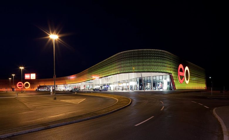 The shopping mall EO is the first power center in Austria. It is composed of two sectors. The larger of the two is a closed off space, with 30 shops, representing the "classic" shopping mall, whereas the smaller (12 shops) is inspired by a marketplace - sheltered rows of stalls outdoors. Customers can wander between the structures, yet also enter each separately from outside. The building adapts by forming a wide arch toward the parking lot in order to ensure easy access to both the "indoor" and "outdoor" mall. As the first building in this type in Austria, the EO set standards and inspired many designs in the future.