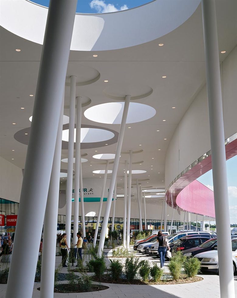The round and smooth shape of the building fits harmoniously into the surrounding environment. The parking spaces have been arranged so that each shop is within short reach. Different shape and colour concepts draw attention to the variety and quality of shops and gastronomic establishments on offer.