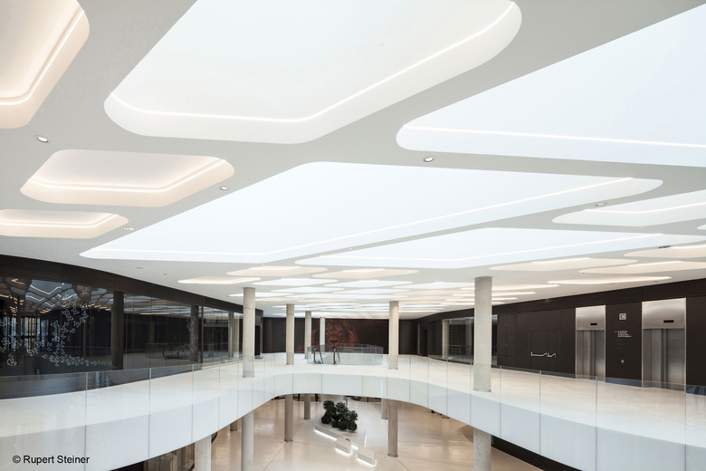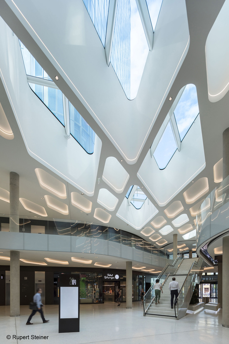 The bustling plinth combines the three towers on the ground floor as well as the first basement floor and the first floor. It acts as a large public space giving tenants access to a variety of shopping and catering areas. At the same time, it connects the towers with the neighbouring facilities, and opens up the site towards Vienna Central Station (Hauptbahnhof), allowing direct access to the train station and public transport services of Vienna’s underground and urban line networks.
