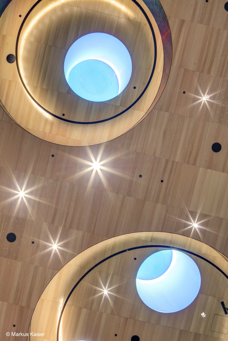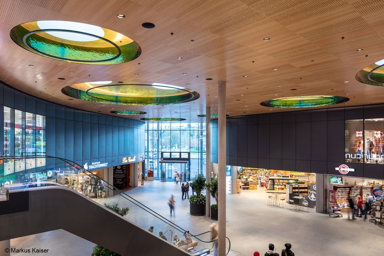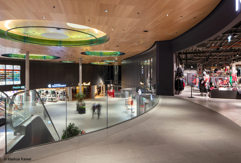 WEZ comes with a novel look and an improved functional organisation. The room layout has been rearranged in such a way that it ensures the optimal use of space and an extended rentable area. The dominant feature in the interior is a large atrium with circular roof lights which enables easy viewing of the stores and an efficient circulation. Round light funnels in the ceiling run along the entire atrium and bring daylight down to the ground. Lighting units also relate to the circle. Depending on the season and time of the day, one can easily change the atmosphere of the space playing with natural and artificial light. Uniform granite flooring and wooden panels on the ceiling play an important role in making the space warm and inviting.