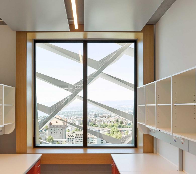 The AGORA Pôle de recherche sur le cancer, located in Lausanne within sight of Lake Geneva, specifically provides working and research space for 400 scientists and practitioners under one roof. The major focus was on a comprehensive, holistic concept to design communication and working spaces for the cancer research center. Existing visual connections on the site and to the landscape beyond were crucial for a cautious formulation and adaption of the building mass. Thus, the building’s sculptural character makes it easily recognizable within its surroundings and contributes to its autonomous presence.