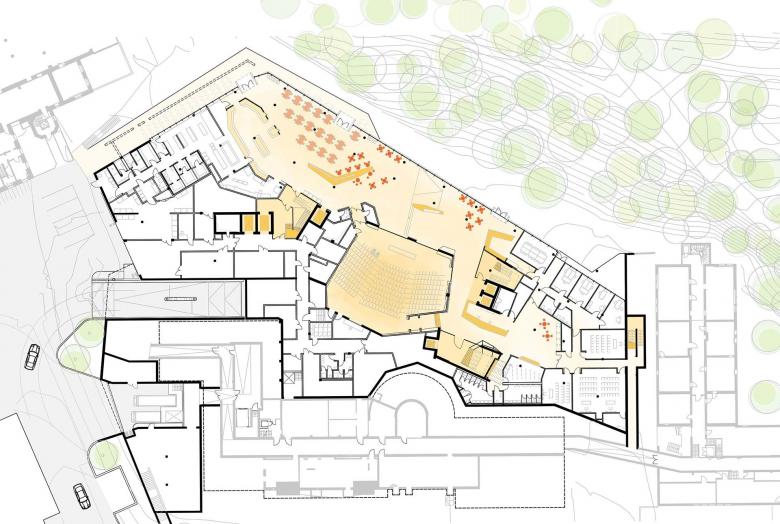 In addition to the high quality of residence in the professional environment, communication plays a central role, both inside and outside. The Agora area, the public level of the cancer research center, connects the campus’s existing pathways to the laboratory and office levels via interconnected communication areas and informal workplaces. The Atrium, main entrance of the building, offers public meeting points and enables exceptional events to take place.