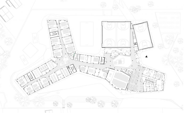 The school has a diverse spatial program, incorporating classrooms for general teaching and for specialized courses, common areas, staff rooms, and spaces to accommodate the administration and the functions required for day-to-day operations. The careful structuring of these spaces is offset by their varied arrangement in relation to one another. Two sports halls—one single-purpose and one dual-purpose—and a multifunctional room are available for physical education classes or club sports. Rounding out the spatial program are supplemental amenities in the form of a media library and a community school with a parents’ café and youth room: this means that the building is open outside school hours as a neighborhood resource for social interaction. Additional events and offerings are an inviting way of involving and nourishing the community. The school building thus forms a natural part of the local milieu, figuring as a vibrant meeting place and focal point open to neighborhood residents and thus makes an effective contribution to a vision of the future in which different generations interact and cooperate with one another.