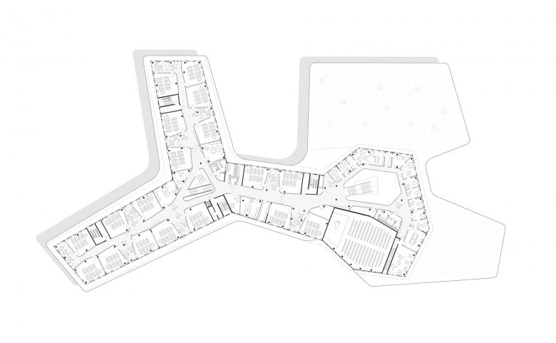 Inside, the look and feel of the new school is determined by a sense of lightness and openness. The overall mood is established by playful features, such as spaces inspired by the idea of a market square and other areas bustling with activity. Light floods into two atria, which provide vertical connections within the building.