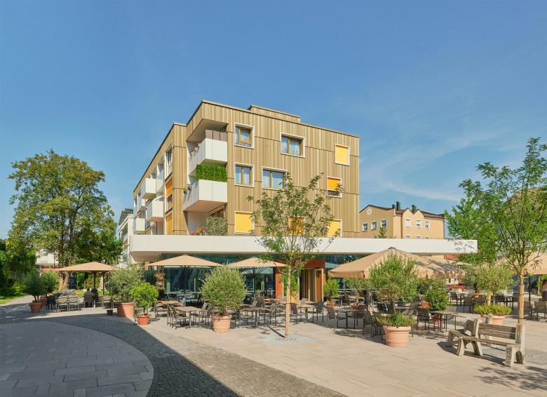 The new mixed residential/commercial building is a confident and harmonious addition to the square in front of Kolbermoor’s town hall, rounding off an existing ensemble consisting of the town hall, library, adult education center, and parking structure. It contains four stories of affordable, municipally owned housing, while a restaurant on the ground floor enlivens the square with a welcome new facility.