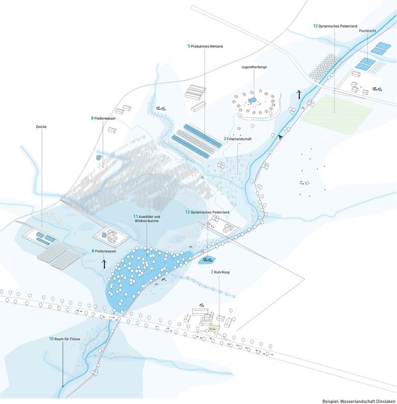 Die Schwammstadt steht für einen produktiven Umgang mit der Ressource Wasser. Die Ökonomie des Teilens verbindet die Themenstädte.