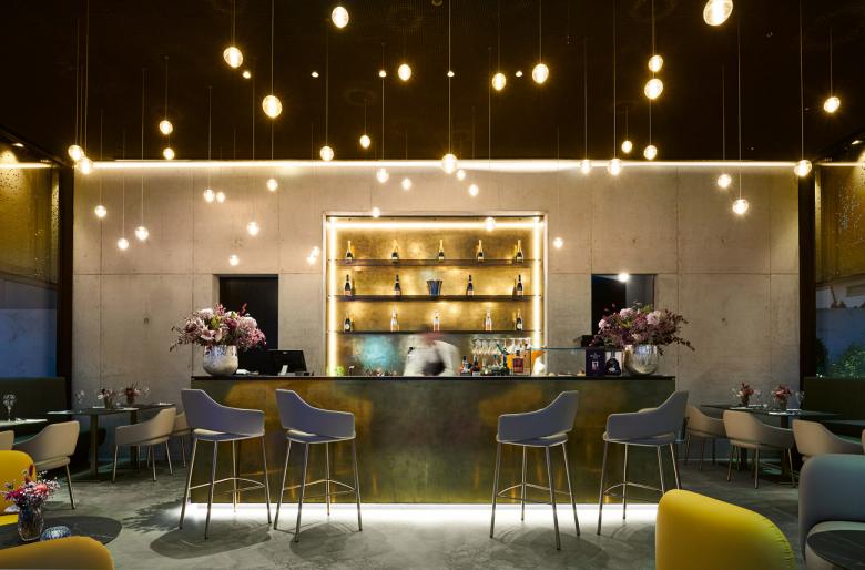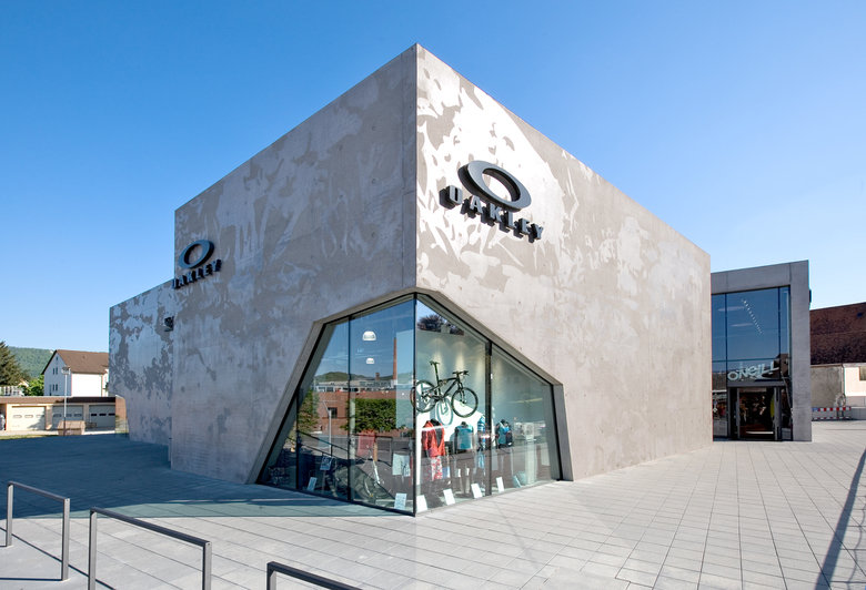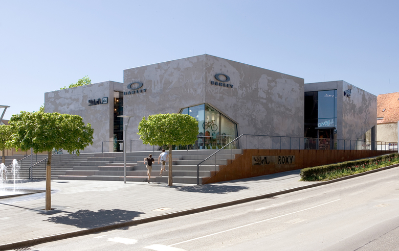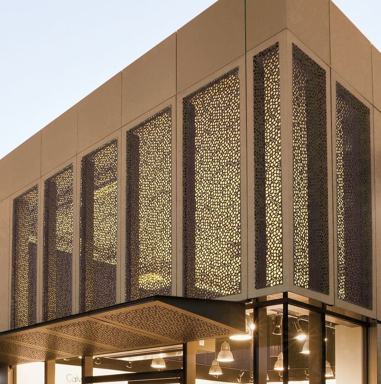 Das Erscheinungsbild der fünf Outlets setzt sich wechselnd aus einsehbaren und blickdichten Fassaden zusammen und zeigt sich in schnörkelloser Metallhülle, die sich wie ein Maßanzug um die Gebäudeteile legt; aufgebrochen nur dort, wo es der Raumkommunikation dient. Für jedes Outlet sind spezielle Lochmuster entwickelt worden, die den Bezug zum Gerber- und Textilhandwerk herstellen. Die unterschiedlich ausgeprägten Pattern unterstützen in Verbindung mit verschiedenen Eloxaltönen den Charakter der hier einquartierten Marken. Anders jene Fassadenteile, die in Richtung Pulverwiesen zeigen – sie korrespondieren in ihrer Putzstruktur mit der angrenzenden Wohnbebauung.