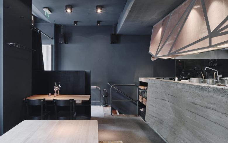 The geometrically pleated counter block made from rammed earth, realized by Martin Rauch, Austrian pioneer in rammed earth building techniques, is the dominant design element. In the context of sustainable building, this ancient building material, deeply rooted in the tradition of the Near East, has regained importance in the past years. A canopy made from Austrian linen, steel and glass continues the geometrical design and completes the reduced ensemble. Atmospheric lighting accents intensify the relaxed ambience based on traditional Japanese soup kitchens.