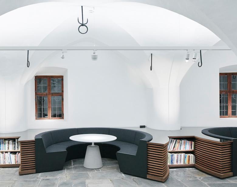 Unter Berücksichtigung des besonderen Baudenkmals und der speziellen Begebenheiten auf Schloss Ambras Innsbruck wurde ein minimalistischer und behutsamer Umbau der gotischen Gewölberäume umgesetzt. Der konzeptionelle Entwurf greift eines der wichtigsten Elemente der Renaissance, den Kreis, auf. Flache, radiale Sitzbankmöbel im Gastraum nehmen sämtliche technische Einbauten auf und reflektieren mit broncierten Spiegelflächen die beeindruckenden gotischen Spitzbögen. Die Planungen erfolgten im Auftrag des Kunsthistorischen Museumsverbandes Wien.