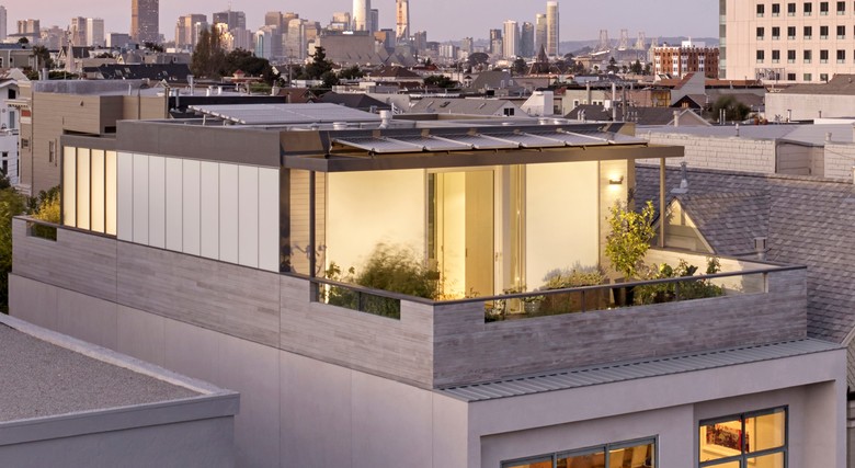 Noe House is a top-story addition to a mid-century house in San Francisco. The new penthouse is a modern pavilion atop the original stucco structure. Daylight bathes the interior through multiple skylights, windows and operable walls. Landscaping surrounds the interior in two roof decks and an inner courtyard. Steel frames support glazed windscreens, trellises and solar pv panels.