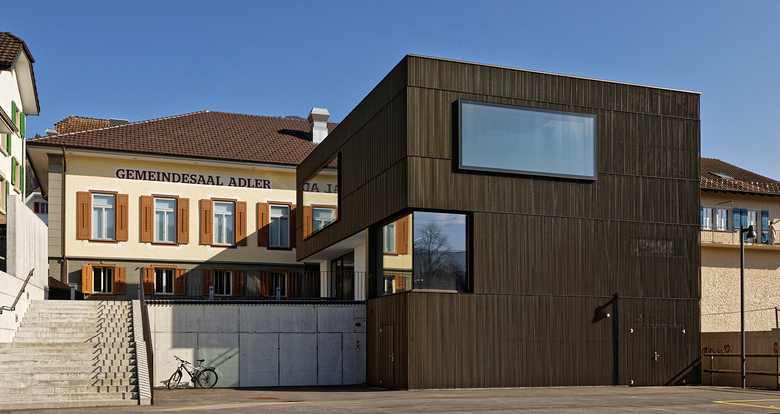 Sensibler Umgang mit Schützenswertem – Der von der kantonalen Denkmalpflege als schützenswert erachtete Adlersaal in Schüpfheim wurde sorgfältig restauriert. Täfer und Parkettboden mussten erhalten bleiben, dafür wurde die Bühne verkleinert, um mehr Raum für Plätze und Tische zu schaffen. Mobile Bühnenelemente ermöglichen, die Bühne bis auf die doppelte Grösse zu erweitern und diese im Bedarfsfall auch abzustufen. Im dreistöckigen, mit einem Lift ausgestatteten Anbau, der vom Saal her direkt über eine Passarelle erreicht wird, befinden sich eine kleine Küche, ein Foyer, diverse Lagerräume, eine Garderobe sowie die Technik- und Sanitäranlagen. Der grosse Aussenplatz ist über eine Treppe mit dem neu gestalteten Parkplatz verbunden. Der Parkplatz auf dem Adlermättli ist nicht nur für die Bewirtschaftung des Gemeindesaals, sondern auch für das Gewerbe im Dorf von grosser Bedeutung.