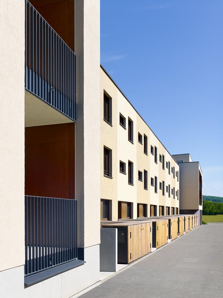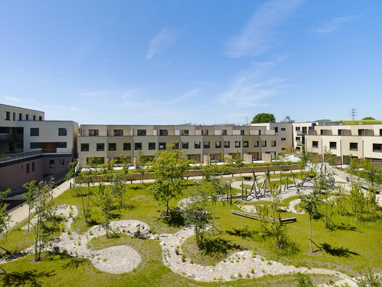 Construction of a housing area with 28 terraced houses, 36 flats, day care centre and nursery on the ground floor as well as underground parking with 125 places