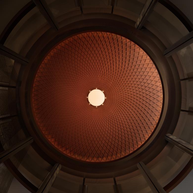 Entering the lobby feels like stepping into an intimate gathering at the heart of the steppe. The soaring dome opens like a yurt, embracing visitors in earth-toned warmth. Red brick walls murmur softly in the shifting light, as though tracing the footprints of migrating herders. Overhead, the dome unveils layered, scale-like patterns—light as feathers, yet evocative of thawing earth. These textures resonate with the rhythm of the evenly spaced columns below, creating an interplay of solidity and lightness, and revealing a serene, understated sense of openness.