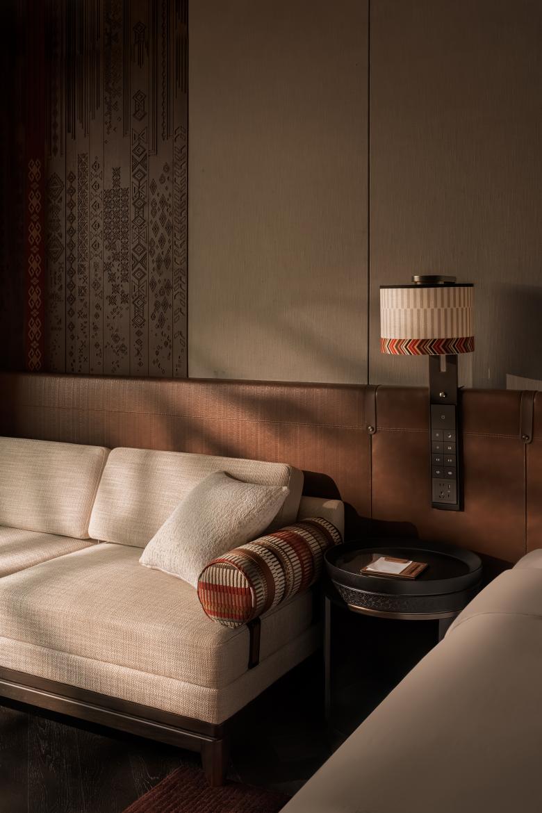 Throughout the space, craftsmanship reveals itself in subtle, thoughtful details. Motifs drawn from local ethnic traditions are woven into the carpets underfoot, while the backdrop behind the reception desk is adorned with artworks crafted through traditional felt-thread techniques. Together, they offer a quiet, wordless narrative of this land—its stories, its heritage, and its enduring spirit.