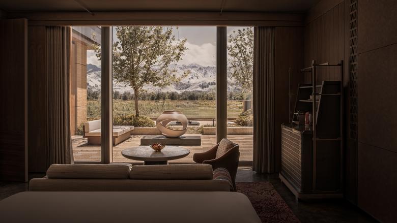 The space exudes a quiet sense of restraint, echoing the vastness and quiet composure of the grasslands. A sweeping curved window frames a boundless view, drawing the distant Nalati Grassland and the majestic Tianshan Mountains into the interior. Light becomes a poetic storyteller, tracing the shifting seasons across a brick-red canvas.