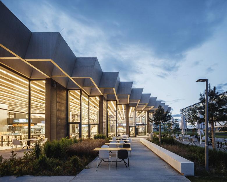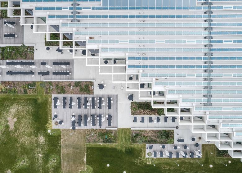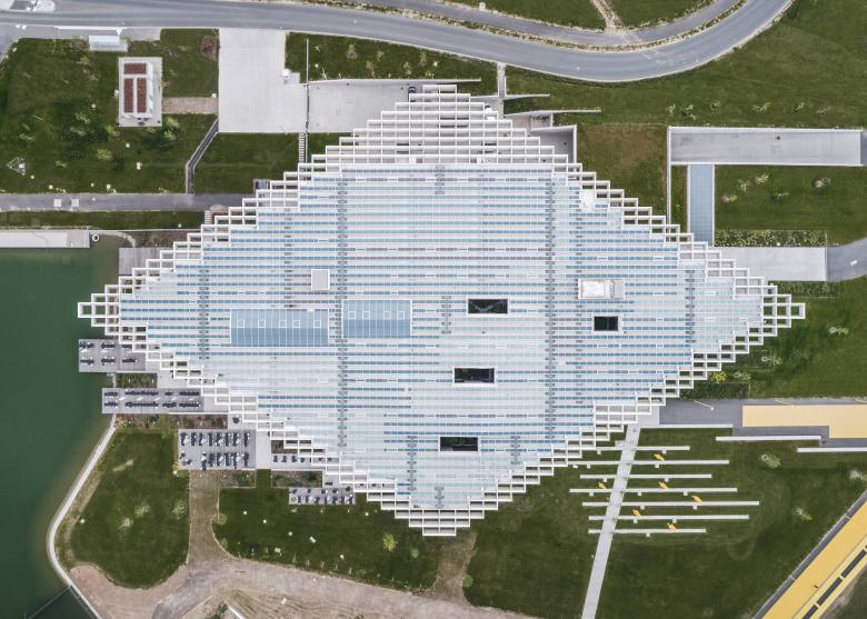 “To accommodate the many internal and public functions that HALFTIME includes, we designed a versatile, multi-purpose building that brings as many of the company’s activities and functions as possible together under one roof. The huge rhomboid roof covers the entire building like a carpet, bringing staff, visitors and brand ambassadors together in the same building and thus enabling more and wider contacts,” says COBE’s founder, the architect Dan Stubbergaard.