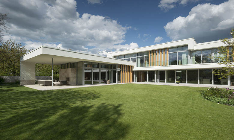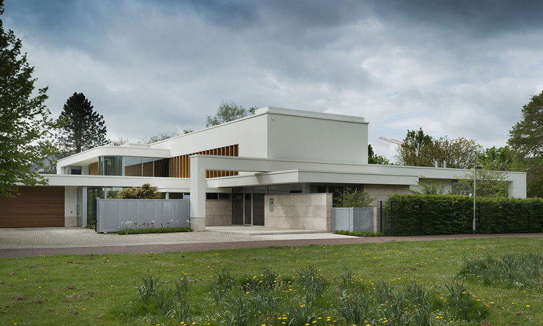 Elongated walls, covered with Bauhaus Travertine and plaster together with cantilevered roofs and vertical oak lamellas define the elegant appearance.