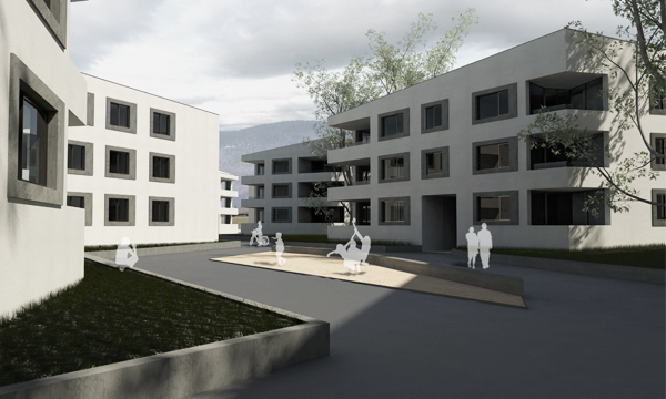 Le projet consiste à offrir au village de Borex une nouvelle centralité susceptible de créer une animation pour le village. La densification de la parcelle est obtenue par la mise en place de 7 plots offrant une diversité de vue et d’espaces publique au quartier.Le plot en contact avec la place accueille les fonctions publiques (magasins, auberge et salle communale). Un passage relie la nouvelle place du village à l’espace communautaire du quartier de logements (75 unités).La forme pentagonale des bâtiments offrent une diversité typologique important ainsi que des vues cadrées sur le Jura et les Alpes.