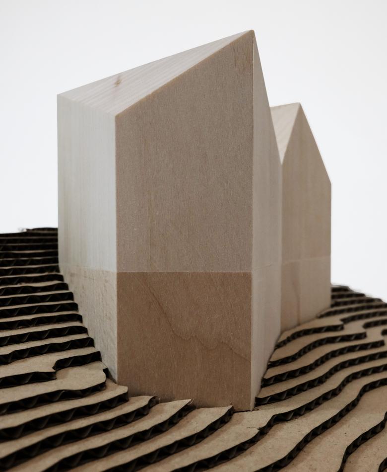 Die beiden Haushälften bieten jeweils auf drei Stockwerken Unterkunft für bis zu 10 Personen. Die Gebäudevolumetrie und die Dachgestaltung unterstreichen den zweiteiligen Charakter des Hauses.