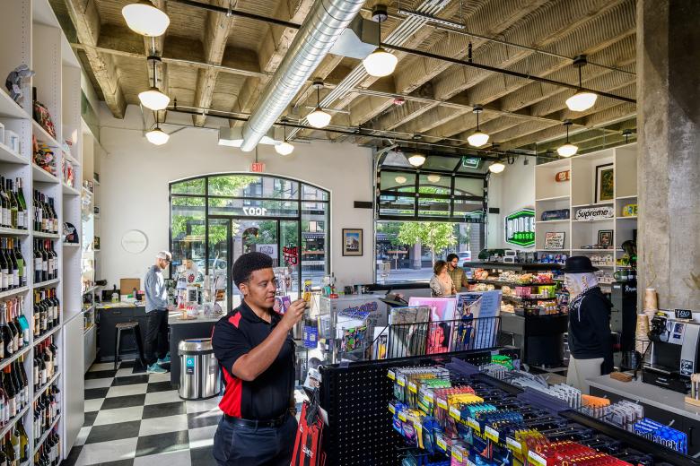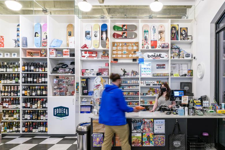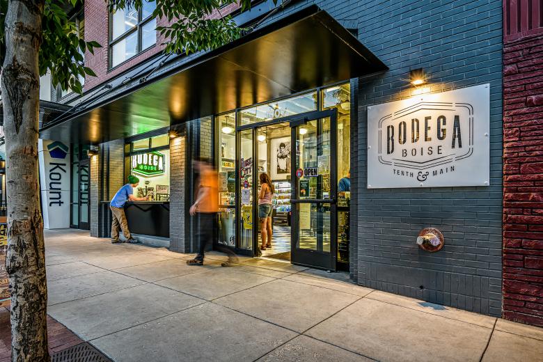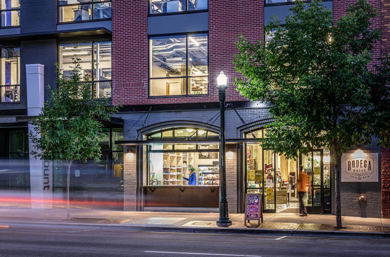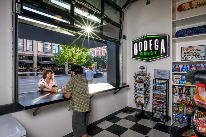 Bodega Boise is a 1,500 sq. ft. tenant improvement in the historic Tenth and Main/John Alden Building, on Main Street in downtown Boise, ID. The Bodega is an upscale convenience store offering sundries, food, and beverages to local residents and workers. The historic concrete cast-in-place structure is a featured part of the interior architecture. Mirrors were added above the retail shelving along the perimeter to visually continue the concrete ceiling; and a roll-up, overhead door connects the inside to the bustling sidewalk and cityscape beyond, exposing a counter for enjoying grab-and-go items.