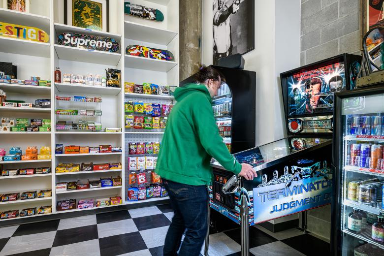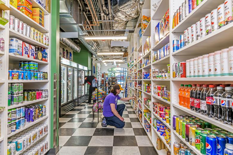 The colorful and quirky interior channels the owner’s affinity for expressive and playful details, including a pinball machine for entertaining patrons inclined to linger; while high ceilings, bright lights, and exposed mechanics communicate a fresh, modern take on the traditional city bodega. In typical bodega fashion, there is a featured display of wine and spirit offerings.