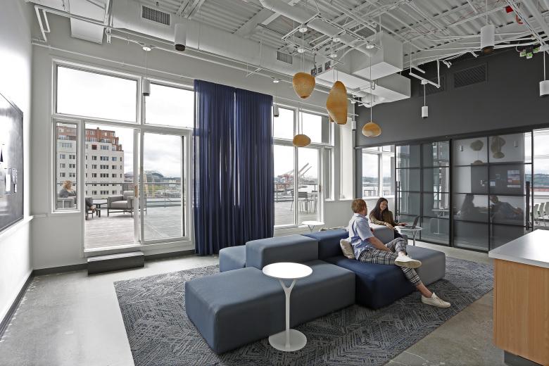 Cushing Terrell’s 9,000-square-foot Seattle office, located in the penthouse of an historic warehouse building, boasts uninterrupted views of the downtown waterfront and Olympic mountains, and draws inspiration from the moody hues and varied textures of the Puget Sound and Pacific Northwest coastline.