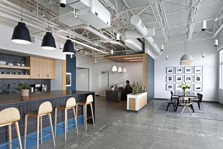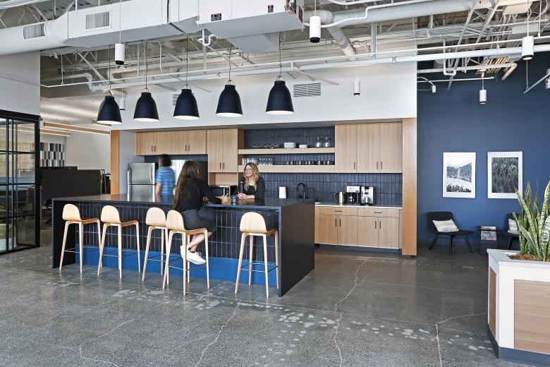 Adjacent to the open format breakroom is the design lab, situated behind large, sliding glass doors. An extension of the community gathering space, the design lab encourages collaborative, creative problem-solving with the benefit of a full library of materials and resources.