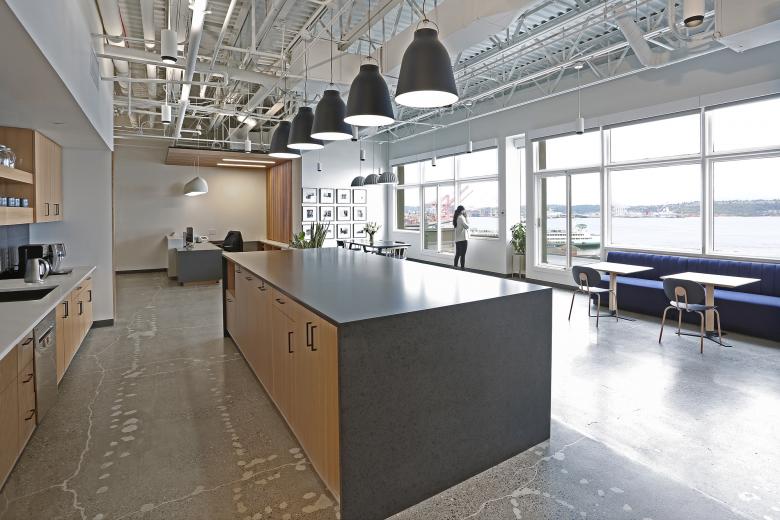 Where once were small, private offices, an open kitchen and dining room have been introduced. As a part of the renovation, the separating walls were removed to expose floor-to-ceiling windows, revealing the office’s greatest asset: views of the surrounding geographic features.