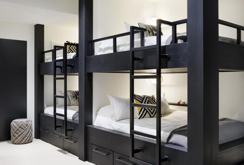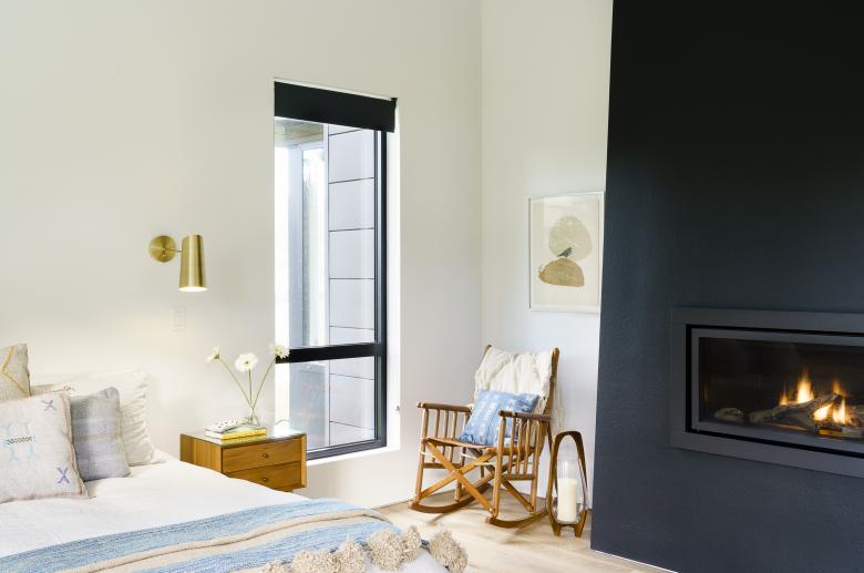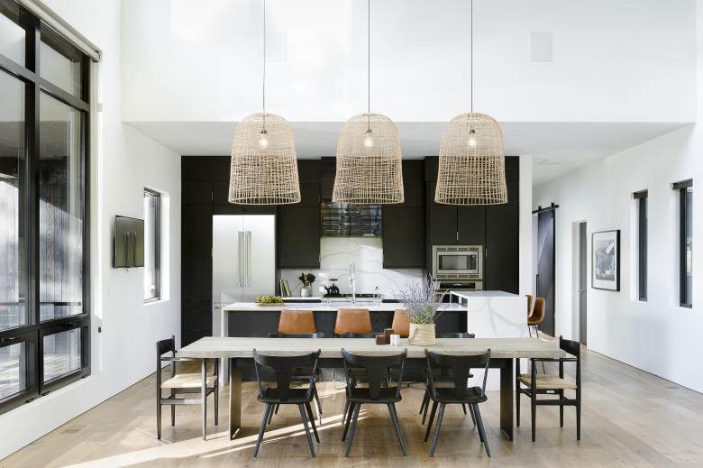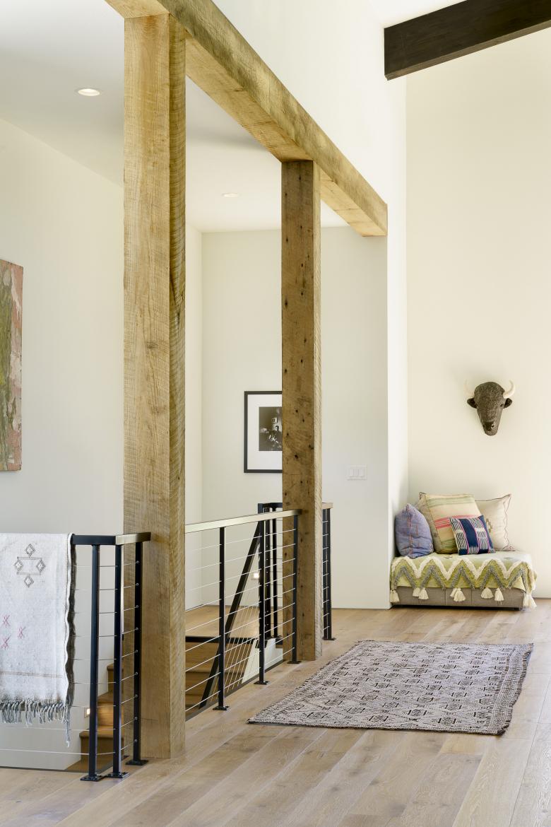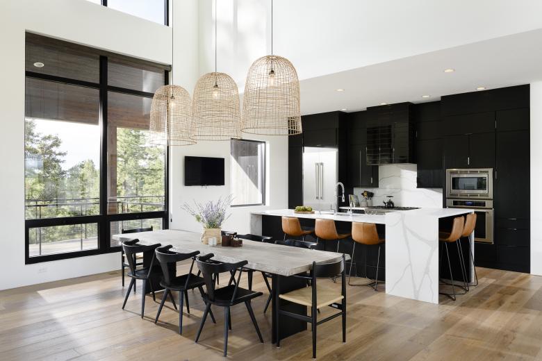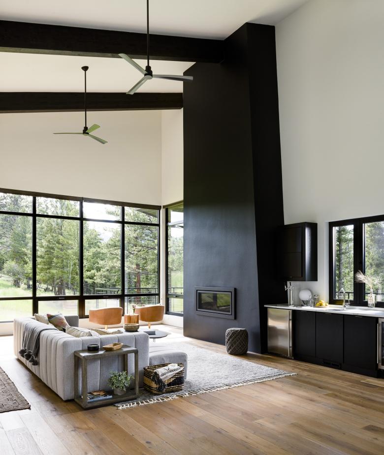 While the home incorporates nods to a Montana aesthetic, such as rough reclaimed wood beams, it is very modern. A simple material palette, white oak floors, and tall ceilings anchored by a floor-to-ceiling fireplace create an open, light-filled space.