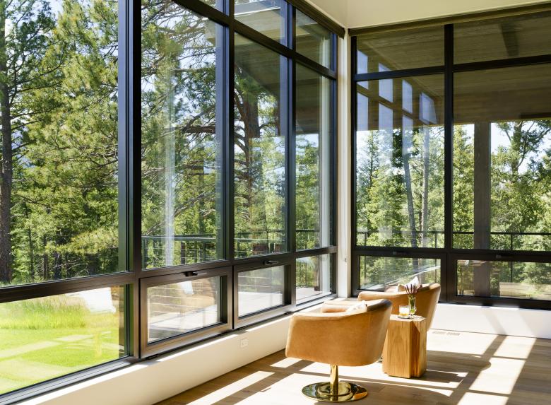 The living spaces are oriented toward views of Trapper Peak, so no matter where you are in the home, you have a framed view of the mountain via large windows. The house was intentionally designed to look minimal from the front and blend into the tree line, while the back of the house is expansive with “walls of glass” that create a tree-house-like feel.