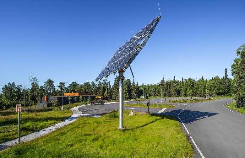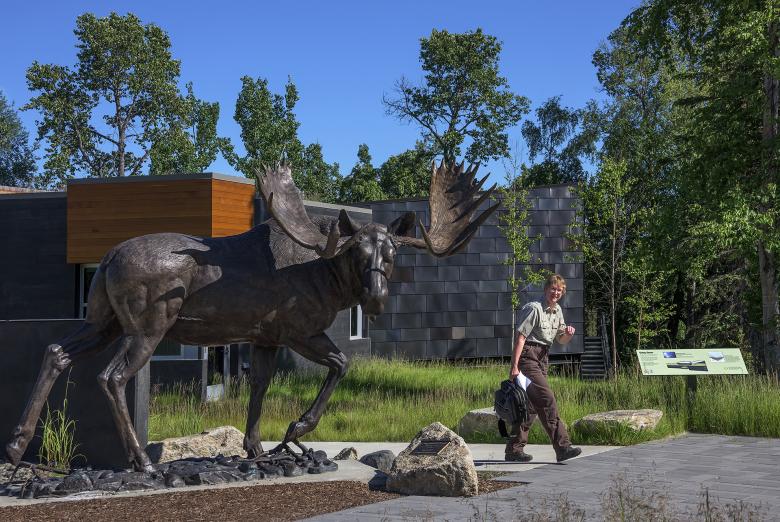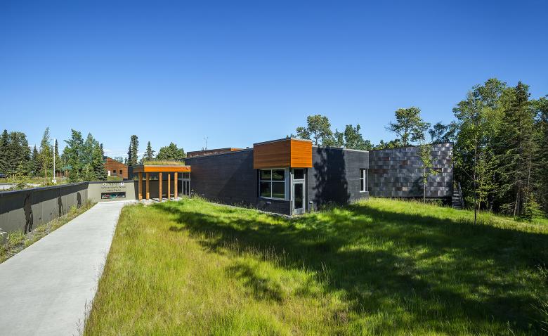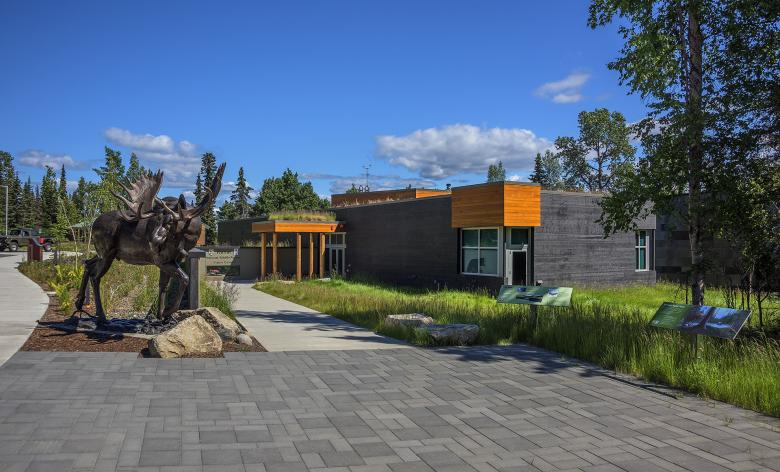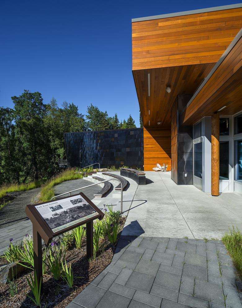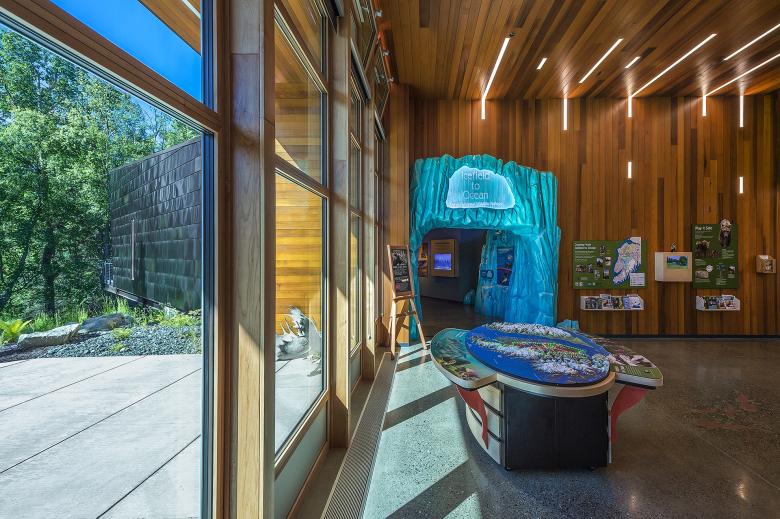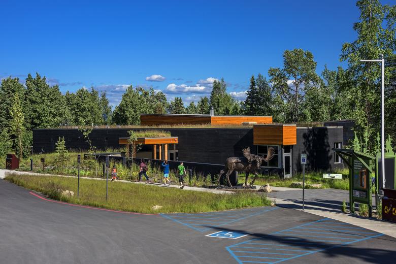 The new visitor center provides programming year-round and includes a multipurpose room, exhibit hall, bookstore, accessible restrooms, and lobby/seating areas, along with an outdoor exhibit within the surrounding forested habitat. Incorporating many environmentally-conscious features, the building has a sod roof, PV solar panels, in-floor radiant heating, LED lighting, a natural ventilation system, and a soapstone masonry heater. The $6.1 million project used a design/build delivery method and earned LEED Silver certification.