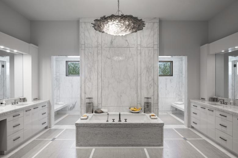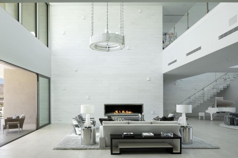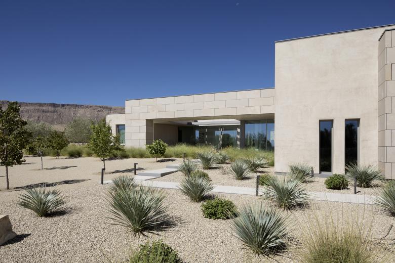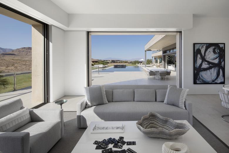 Together, Vigil and the owners decided to rotate the original plan 180 degrees so that the primary indoor and outdoor living areas would gaze at natural rather than manufactured wonders. The structures themselves look elegantly spare, with exterior walls made using Gridworx, a cladding system that holds 1.5-inch-thick panels of durable quartzitic sandstone in a light fawn color that complements the desert palette. Between the sandstone and the interior’s cool white walls of marble, quartzite, other stones, and plaster, are 7 inches of gap-free insulation to help mitigate temperature extremes — as do the triple-paned windows. The custom swimming pool also helps keep things cool; designed to echo the contours of the house, its “knife-edge” puts the surface of the water perfectly level with the surrounding deck, which is a more rough-textured, slip-proof extension of the same stone flooring in the house.