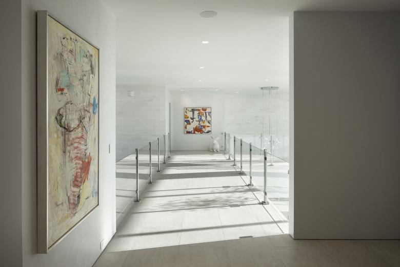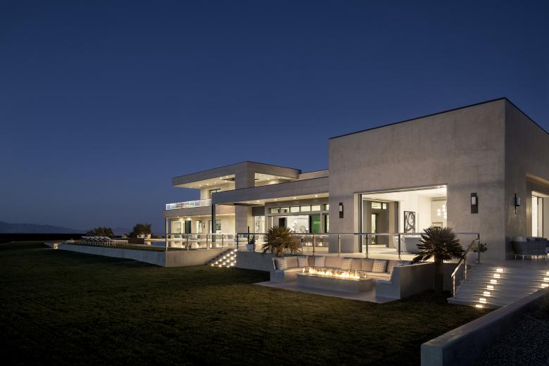 When the floor-to-ceiling windows are open, receding unseen into the walls, the main level is exemplary of indoor-outdoor living. The kitchen, which includes three ovens and two islands — one for prep, the other for casual dining — also features a sunken wet bar with seating on three sides, one of which is located outdoors. Just steps away, facing the deck’s northern side, the pool casita — which includes a pizza oven — offers still more casual seating on comfortable weatherproof furniture, perfect for guests in still-damp swimwear.