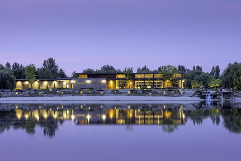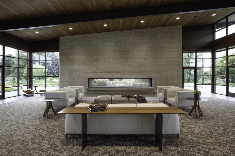 This private retreat of wood, glass, and concrete glows like a jewel box on the lake. The owners envisioned a family oasis that would be restful and serene, open and welcoming, and capable of entertaining large gatherings. They envisioned an environment that blended interior and exterior, seamlessly integrated into its stunning surroundings.