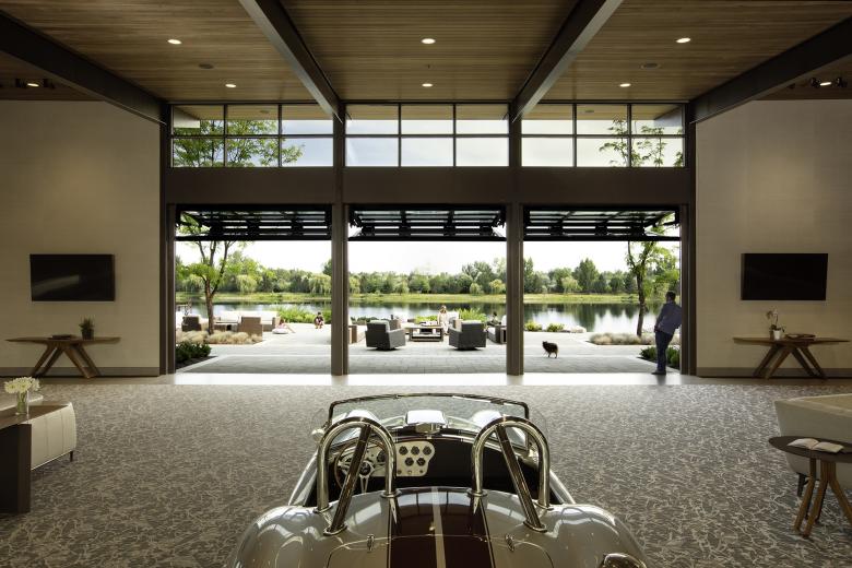 This streamlined and elegant single-family residence features outdoor environments and a large living space that are perfect for entertaining. The envelope allows for dynamic customization: with user-friendly smart technology, the home can easily transition from an open beachfront hangout to a cozy, blacked out theater. The interior and exterior are connected by operable glass hanger doors which frame vistas of the lake, landscaping, beach, and distant architecture. The house’s east-west orientation and south-facing 12 foot overhangs mitigate excess sun exposure and solar heat gain while maintaining expansive views. Finally, the materials link the landscape and building while creating a calm and comfortable home. The house is open and welcoming, but also uniquely private—a blank canvas customizable to suit any occasion.