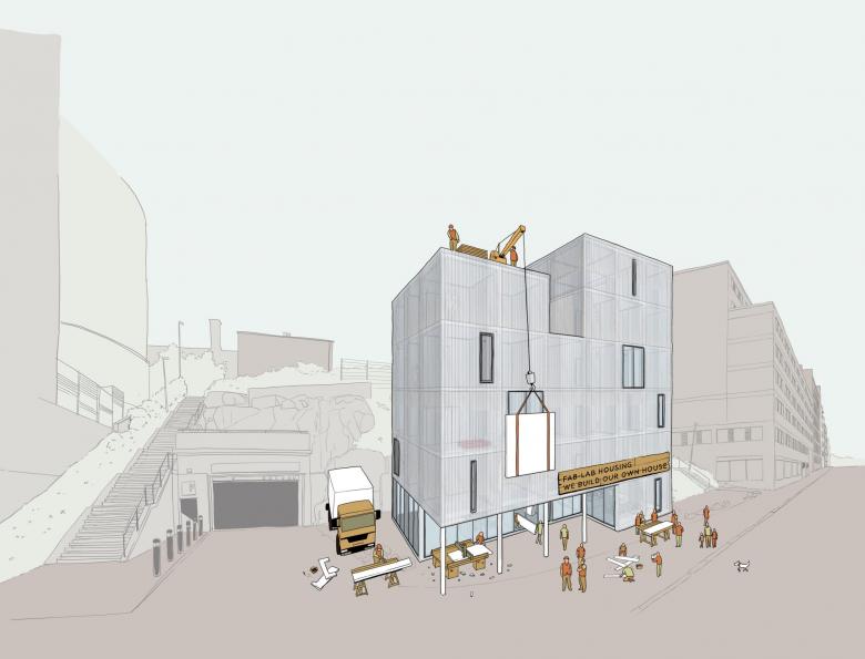 In unserem Konzept haben die Neuankömmlinge die Möglichkeit, bei dem Aufbau ihres neuen Zuhauses mitzuhelfen. Das Bausystem besteht als Primärstruktur aus Holz (Balken und Stützen), Treppen-Kern (Aufzug kann nachgerüstet werden), einer basalen Gebäudehülle aus transluzenten Polycarbonat-Platten sowie je einem Bad und einer Küche je Etage. Dieses Grundsystem kann mit einem Innenausbau, weiteren Fenstern und Sanitäranlagen ergänzt werden. Der Ausbau kann zudem durch eine Zusammenarbeit von Geflüchteten und Freiwilligen geschehen. In der gemeinsamen Arbeit entstehen Kontakte und nachbarschaftliche Beziehungen. Der Ausbau, wie Innenwände und Möbel für die Wohnungen, entstehen in dem im Gebäude untergebrachten Fab-Lab nach einem Open-Source-Prinzip. Das Projekt wird Teil des Wiki-Haus-Netzwerks, welches Entwurfsmuster für Gebäude und Möbel sammelt, austauscht und zur Verfügung stellt.