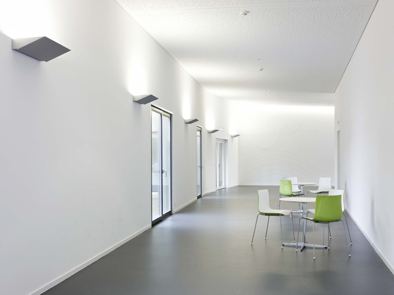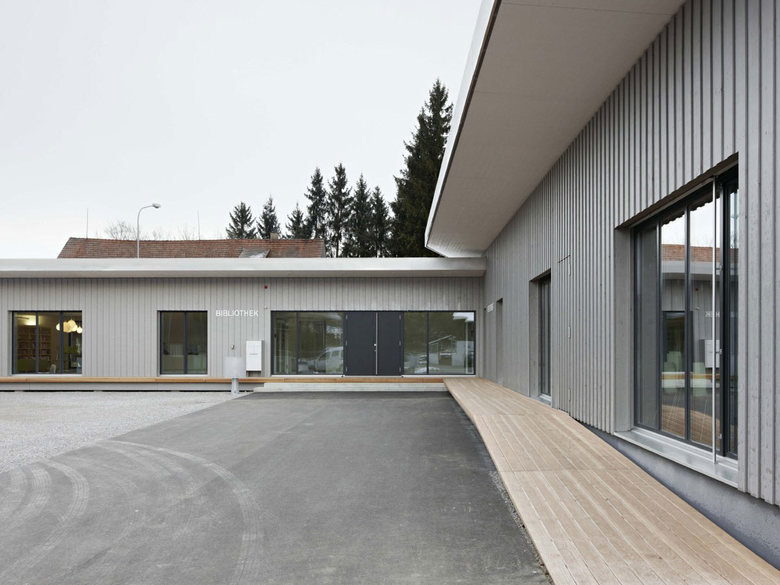 Nach dem Entwurf von Drexler Guinand Jauslin Architekten ist ein größerer Freizeitdienst und eine Bibliothek entstanden. Der bestehende Chramschopf fügt sich mit seinem neuen Vordach optimal ins Ensemble ein. Zwischen den drei öffentlichen Gebäuden spannt sich ein wohnlicher Platz auf. Die Bibliothek und der Freizeitdienst sind jeweils in einem Flügel des L-förmigen Neubaus untergebracht und werden durch den platzseitigen Eingangsbereich und die gemeinsam genutzten Räume verbunden. Das zentrale Anliegen, den Bezug zum Außenraum herzustellen, wird durch die allseitig bodenhohen Fenster unterstützt. Die eingeschossige Architektur erlaubt eine einfache Bauweise ohne Treppen, Aufzüge und aufwändige Fluchtwege. Das Projekt konnte in Holzbauweise umgesetzt werden.