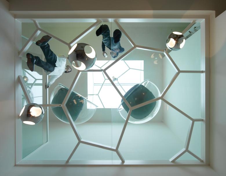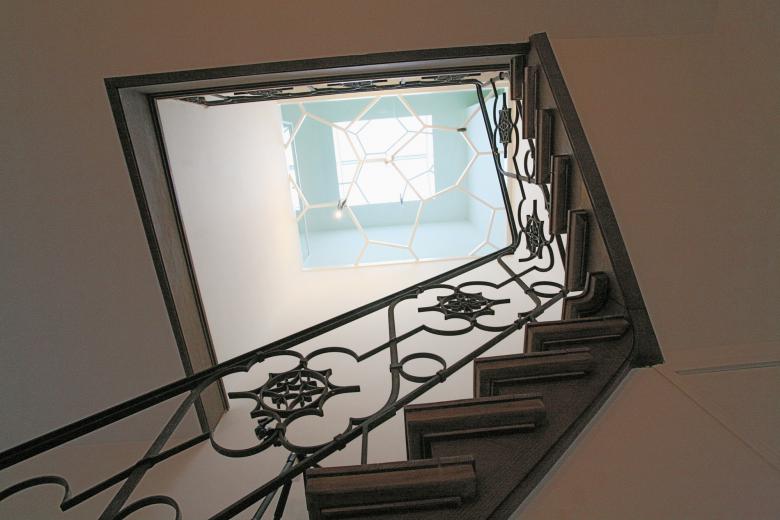 Das Zentrale Oberlicht wurde komplett durch einen begehbaren, transparenten Glasboden auf einer zeitgenössischen Tragstruktur ersetzt. Das Motiv der Tragstruktur ist aus dem 21. Jahrhundert, harmoniert jedoch mit dem zurückhaltenden Jugendstil des Baus.