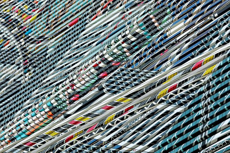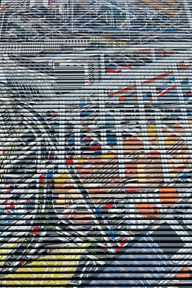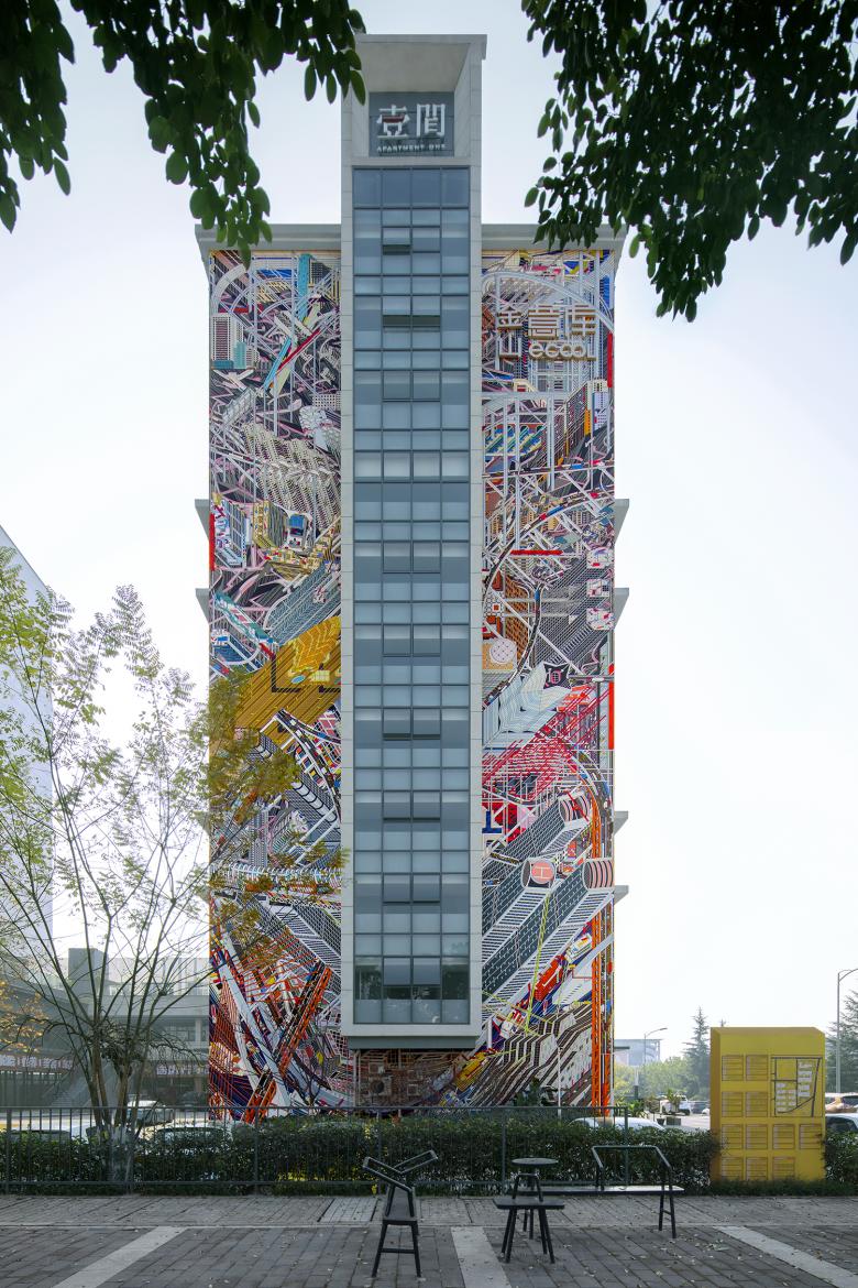 With the unique urban landscape of Chongqing as the theme, DAS created a large mural Chongqing Jungle for ECOOL Creative Park. The city of Chongqing is filled with vernacular spectacles. The mural is a portrait for the city with many local landmarks. A combination of axonometric projection and one-point perspective is adopted in the drawing. Each detail is depicted by axonometric projection, which provides flexible viewpoints and maintains the space continuity. For the overall composition, the upper half is drawn from a low angle while the bottom half from a high one. The projection is made from the edge of the drawing to the center, creating a hidden focal point in the center of the drawing.