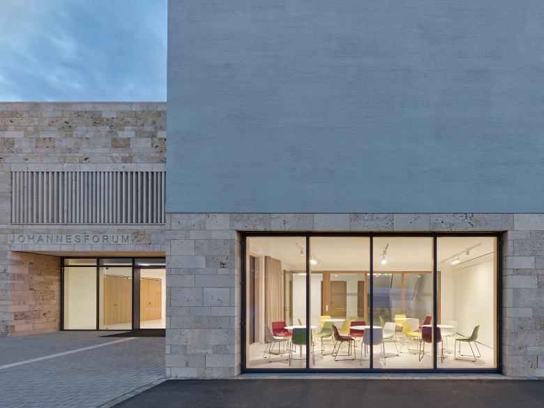 Die beiden leicht zueinander versetzten Baukörper spannen den gemeinsamen Vorplatz auf und definieren den Eingangsbereich des neuen Quartierszentrums. Die beiden Nutzungsbereiche sind Außen wie Innen klar ablesbar. Die gemeinschaftlich genutzten Flächen am Foyer stärken den inklusiven Gedanken des Projektes. Der zweigeschossige, multifunktional nutzbarer Saal im Erdgeschoss bildet das Herzstück des neuen Johannesforums und ermöglicht vielfältige Begegnungen. Ein großzügig gerahmtes „Schaufenster“ ermöglicht die Verbindung zwischen Innen- und Außenraum. Durch den Erhalt des freistehenden Kirchturmes, die Weiterverwendung des eingelagerten Natursteines und den Einbau alter Kirchenfenster konnte die Identität des Ortes beibehalten werden.