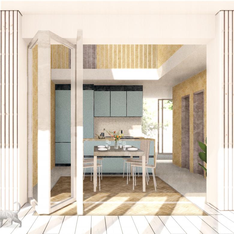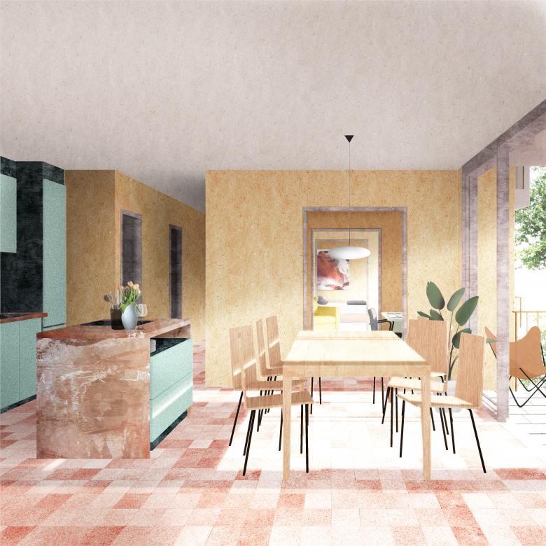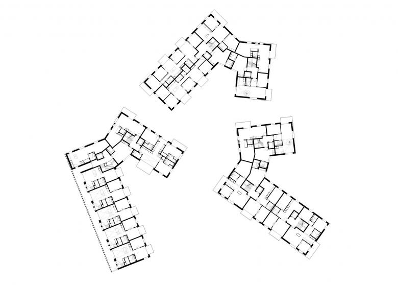 Die Frage nach dem Unterschied zwischen Dorf und Stadt begleitet dieses Projekt. Zwei sich gleichende, aber unterschiedlich grosse Häuser verbinden sich zu einem Gebäude. Entfernt erinnern sie an einen Bauernhof: Wohngebäude mit Wirtschaftsgebäude daneben. Die sich einander zuneigenden Dächer schaffen eine Pseudosymmetrie und die Ambivalenz in der Lesbarkeit. Im Gewohnten entsteht hier etwas Neues, und das Einzelne verschmilzt mit dem grossen Ganzen. Die Aussenräume differenzieren sich in unterschiedliche Stufen der Öffentlichkeit und fokussieren sich auf den zentralen Dorfplatz in der Mitte. Der Wohnungsmix ist von Vielfalt geprägt und reicht von Studioappartments zu einer dreigeschossigen Clusterwohnung. Die Eingangshallen mit angrenzenden Waschküchen dienen als Begegnungsort und übergeordnete Nutzungen wie Mehrzwecksaal, KiTa oder der kleine Sakralraum schaffen zum Dorfplatz hin orientiert eine wohldosierte Öffentlichkeit. Lufträume, Maisonettetypologien mit Galerien und eingeschnitten Patios sorgen in den Dachgeschosswohnungen für spannende Raumabfolgen und ganz eigene Charaktere.