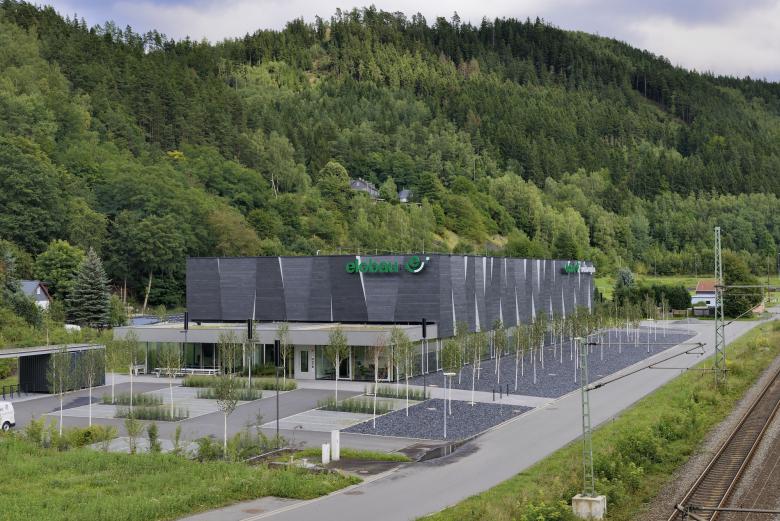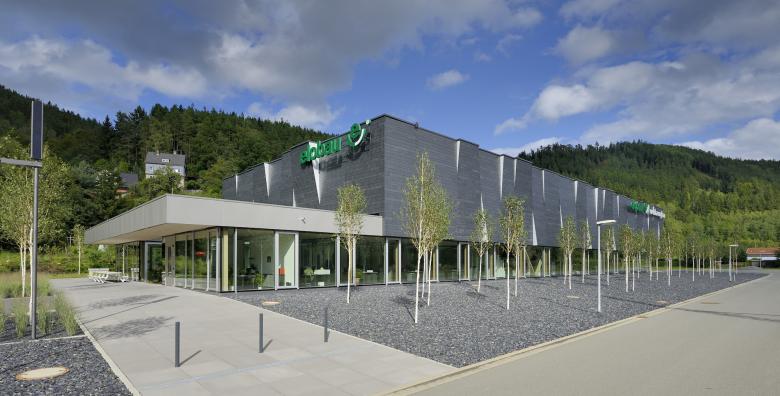 In einem abgelegenen Gewerbegebiet nahe der ehemaligen innerdeutschen Grenze im Thüringer Schiefergebirge wurde ein Betriebsgebäude errichtet, das Maßstäbe in Punkto Nachhaltigkeit und Design setzt. Der Bau besteht aus einem flachen Kopfbau mit Büros und der direkt an die Büros angrenzenden Produktionshalle mit ca. 1.250 m² Fläche.