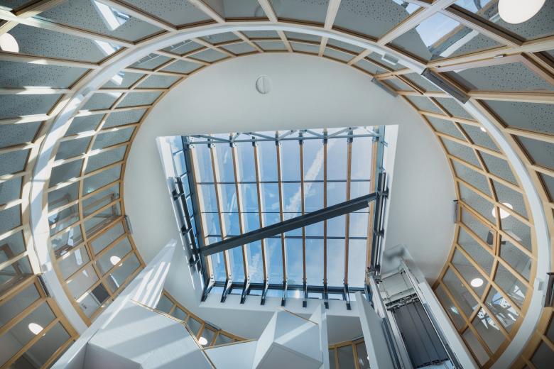 Die gesamte Mittelzone in allen drei Geschossen, die im Wechsel Marktplätze, Innenhöfe, Besprechungs- und Teamräume aufnimmt, ist durch die Innen- und Außenverglasung transparent und offen gestaltet.