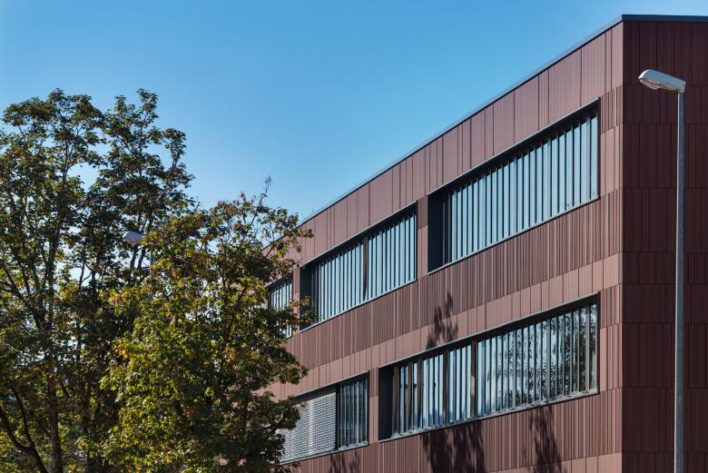 Die Fassade des Neubaus wird durch ziegelrote Keramikelemente, die als Reminiszenz an die Ziegelfassaden der Berufsschulen gestaltet werden. Gegliedert werden die Fassaden durch versetzt angeordnete anthrazitfarbene Bänder aus gekoppelten Holz-Alu-Fenstern. Die Verglasungen werden mit innenliegenden Vorhängen bzw. Rollos ausgestattet, welche als Blend- und Sichtschutz dienen. Die Fachräume erhalten teilweise aufgrund technischer Bedürfnisse eine innenseitige Vollverdunklung.