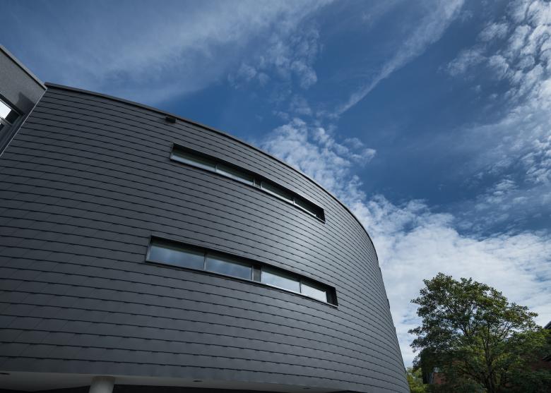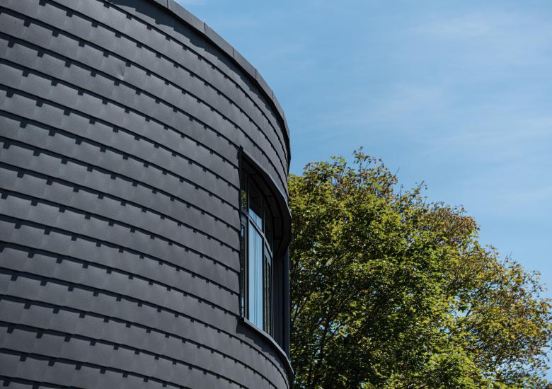 Der Rundbau bekommt eine neue Metallschindelverkleidung, um die aufgrund des Rückbaus der nicht mehr benötigten Reinigungsbalkone sowie des Anschlusses des Verbindungsbauwerks verursachten Fehlstellen und Anschlüsse zu kaschieren und dem Rundbau zugleich eine neue Anmut zu geben.