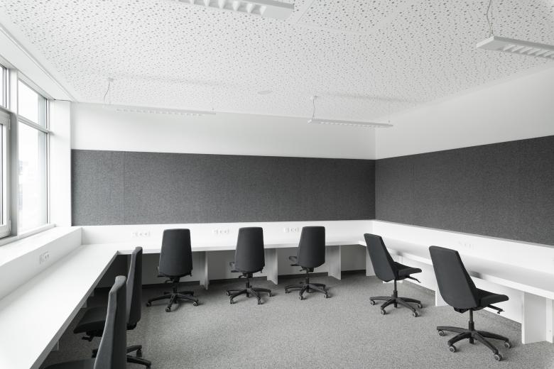 Im kompletten Bestandsbau werden aufgrund von Akustik-Anforderungen neue abgehängte Akustikdecken aus gelochten und farbbeschichteten Gipskartonplatten eingebaut.