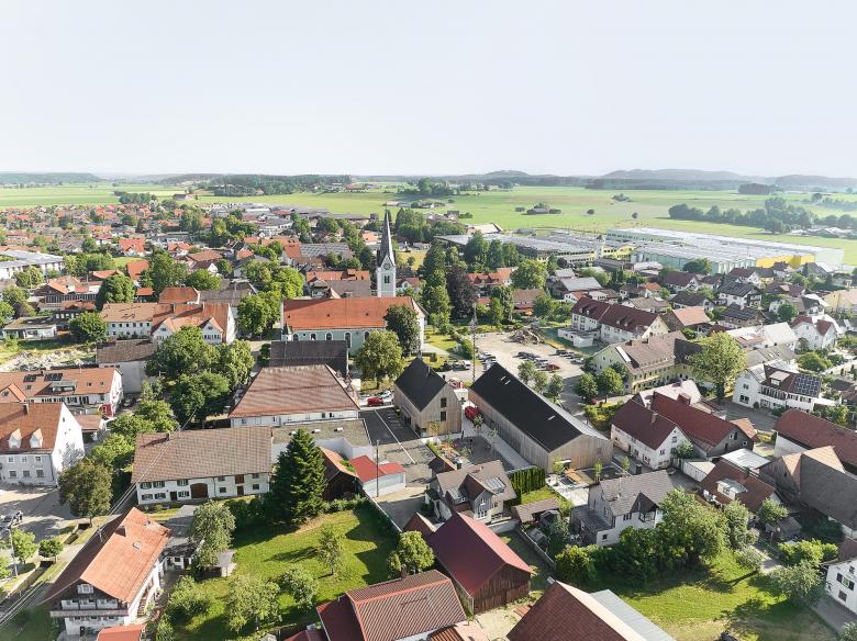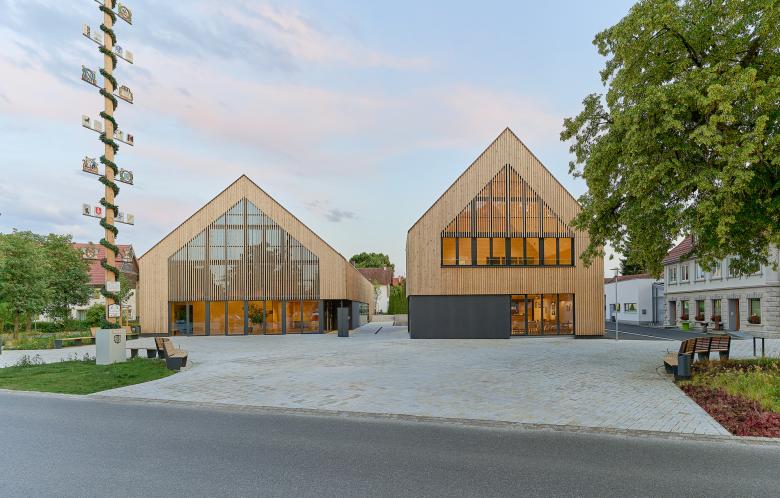 Die neue Bebauung ordnet die Ortsmitte am Marktplatz neu. Neben dem Rathaus im Westen und der Kirche im Norden in etwas größerer Distanz, prägen zukünftig die zwei Giebel von Gemeindesaal und Gasthaus den Raum des Marktplatzes.