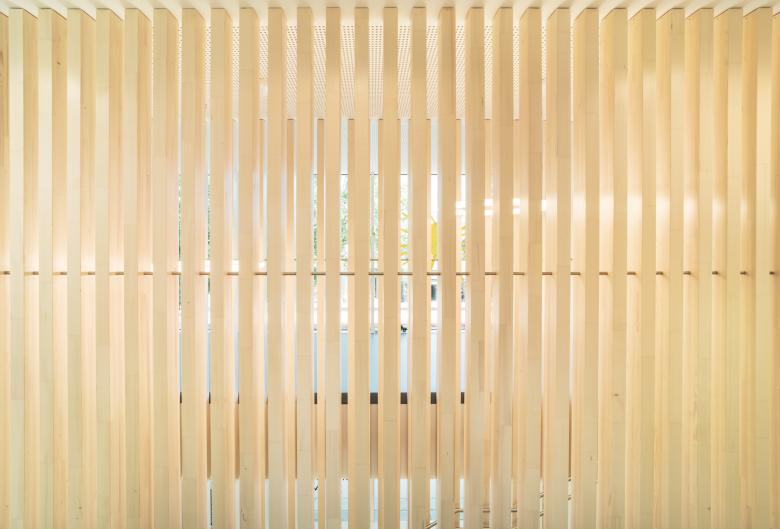 In der Materialität präsentiert sich das Gebäude mit einer Lärchenholzleistenverschalung unprätentiös und betont hierdurch die Einfachheit des Gebäudes.